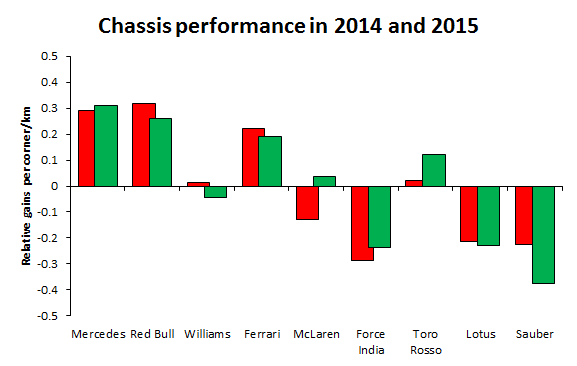A bit correlated to the championship lead is the back-to-back wins frequency. However, there is a difference between seasons when only one driver dominates the season (Vettel in 2011 and 2013) or when one team dominates the season (2014 and 2015). While both cases result in many back-to-back wins, the championship lead is of course much bigger in the former case. The frequency of back-to-back wins shows how predictable the championship is. Indeed, the unpredictable 2012 season (with 7 different winners in the first 7 races) has the lowest percentage (15%) of back-to-back wins.